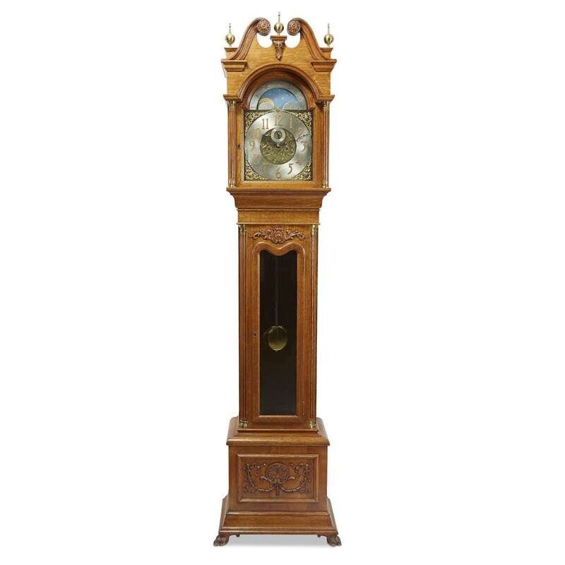 A colonial revival oak tall case clock circa 1900