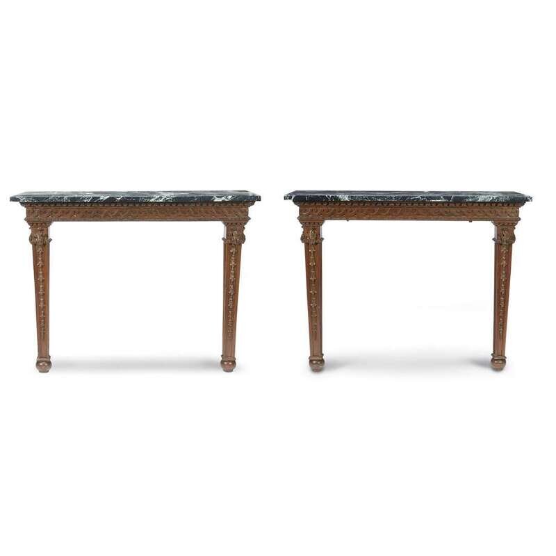 A pair of Neoclassical style pine and marble wall mounted console tables 20th century