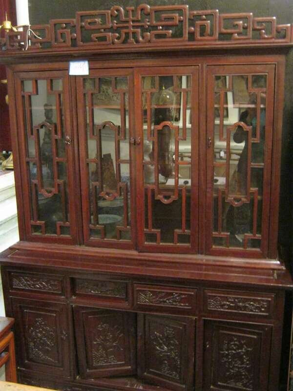 Rosewood in two sections; the upper shelves with glass doors and the lower shelves with carved panel doors.