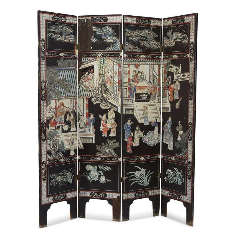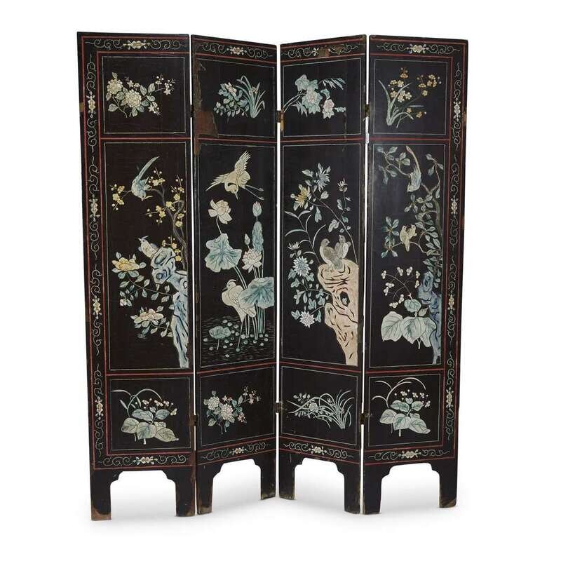 With four leaves, the screen is carved and decorated on one side with a continuous scene of figures in landscapes; each leaf of the reverse is decorated with different birds and flowers.