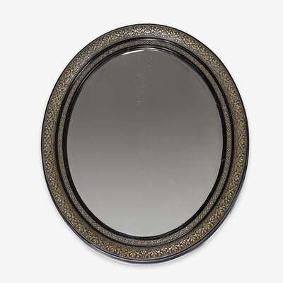 A gilt and ebonized gesso and carved wood oval beveled glass mirror first half 20th century, possibly Continental