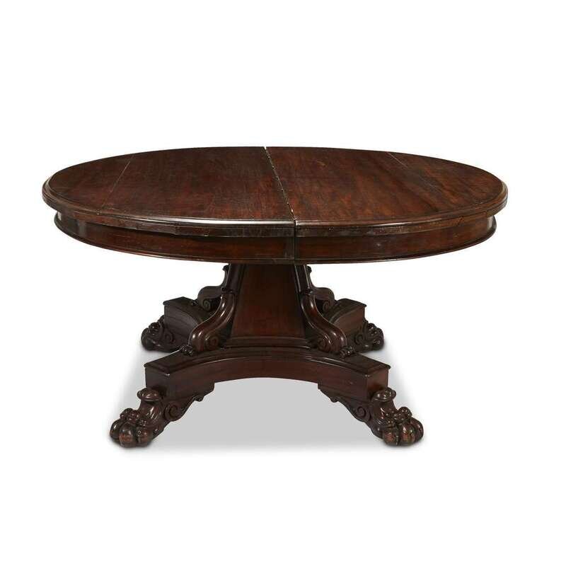 The circular top raised on heavily carved quadripartite pedestal with four paw feet; with two leaves.
