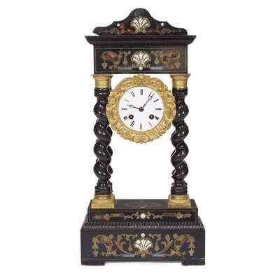 A Napoleon III style brass mounted boulle and inlaid ebonized wood mantel clock late 19th/early 20th century