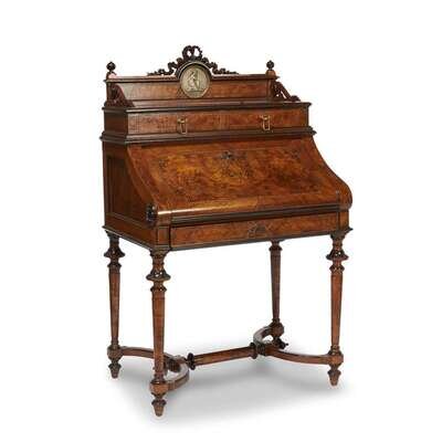 A Napoleon III Renaissance revival parcel ebonized and burled walnut veneered desk circa 1865