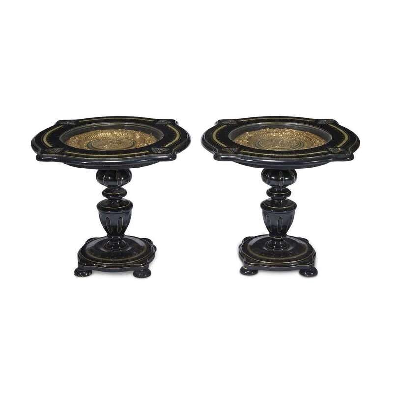 A pair of brass inset and mother-of-pearl inlaid ebonized low tables late 19th century
