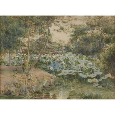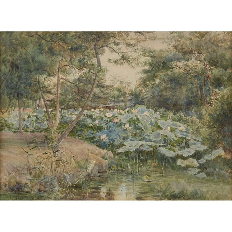 WALTER FREDERICK ROOFE TYNDALE (BRITISH, 1855-1943) PINE AND PINK LOTUSES AT KOFU