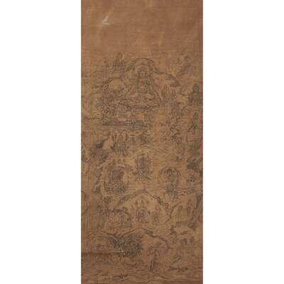 ESOTERIC BUDDHA IN AN EXTENSIVE LANDSCAPE WITH ENTOURAGE Woodblock print, mounted as a hanging scroll.