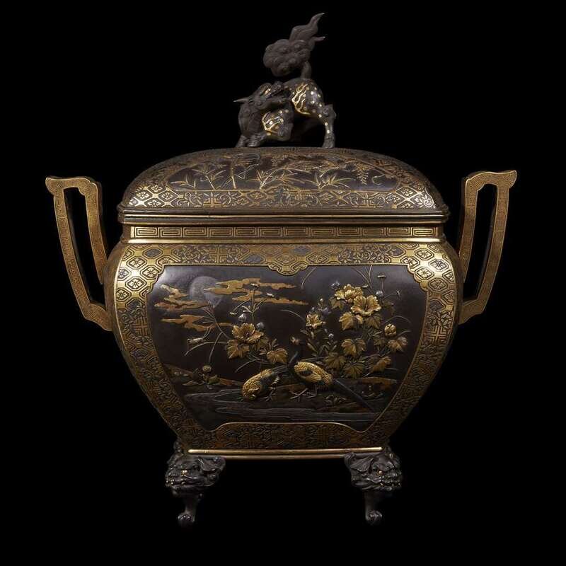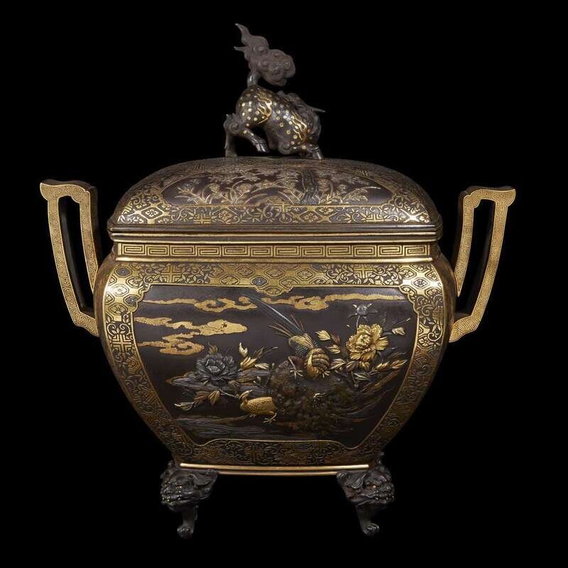 An impressive Japanese parcel gilt and mixed metal patinated bronze koro and cover meiji period, last quarter 19th century
