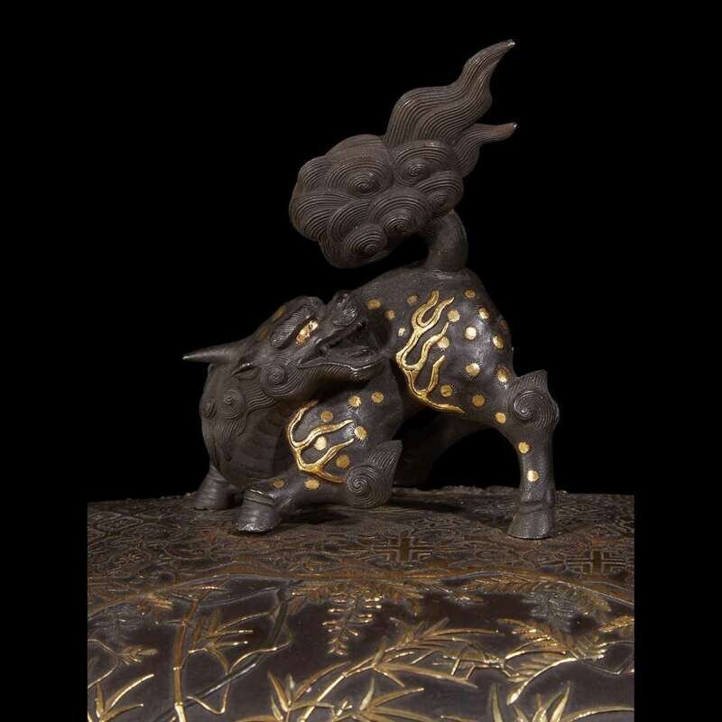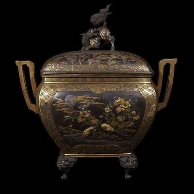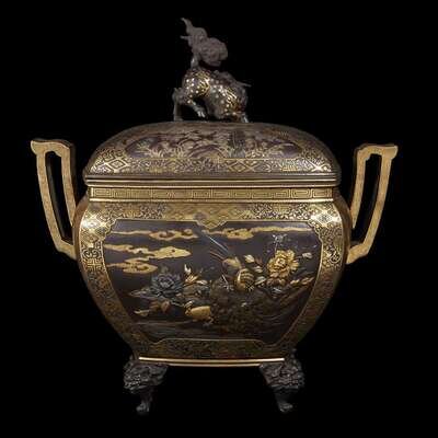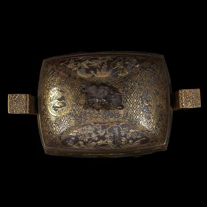 Rectangular with two handles, lion head knees, shishi finial to slightly domed cover, finely decorated, the sides with reserves depicting pheasants, insects and peonies, the cover with reserves of wisteria and flowering trees, all against an etched and parcel-gilt "brocade" ground.
