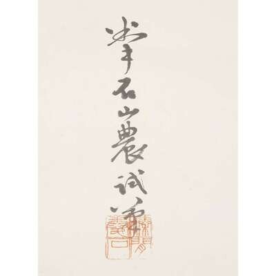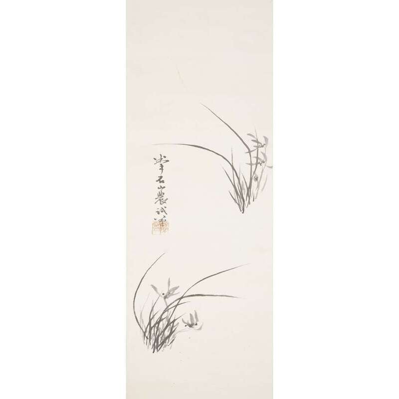 ORCHIDS AND CALLIGRAPHY Ink on paper, inscribed and with seal at center left, mounted as a hanging scroll.