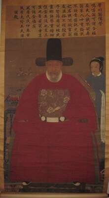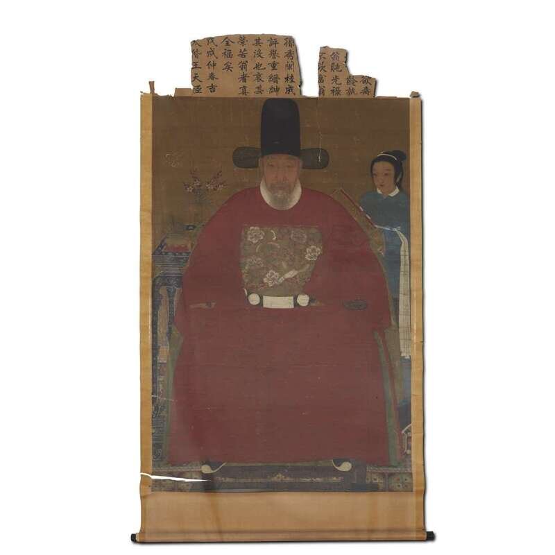 ANCESTOR PORTRAIT Ink and color on silk; with remnants of a lengthy inscription. NOTE: The image with all the losses to the text is the piece being offered. The image of the piece with complete inscription was the scroll as it formerly was, before damages and losses, and has been provided for the benefit of those who would like to see what the inscription had been. the lost parts are no longer extant.