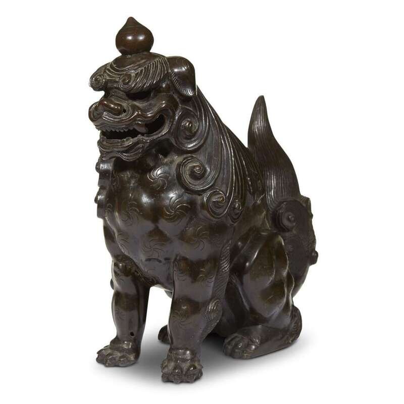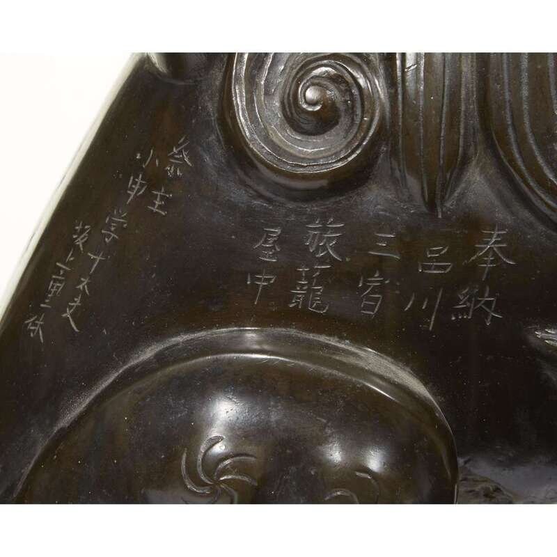 A Japanese patinated and inscribed bronze seated guardian lion Edo period, inscribed to Kansei 12, Koshin year, corresponding to 1800