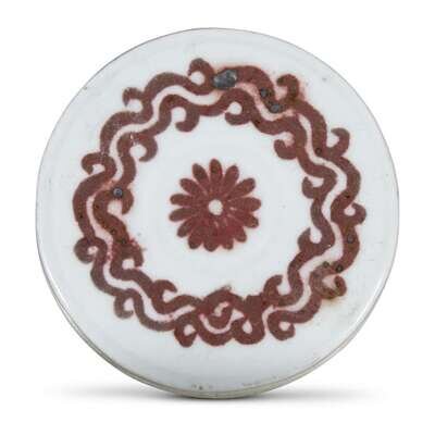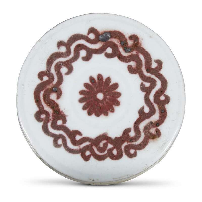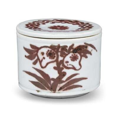 A Korean copper red-decorated porcelain cylindrical "Peaches" box and cover
