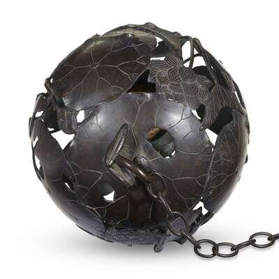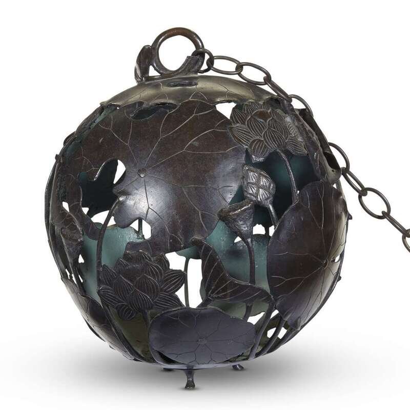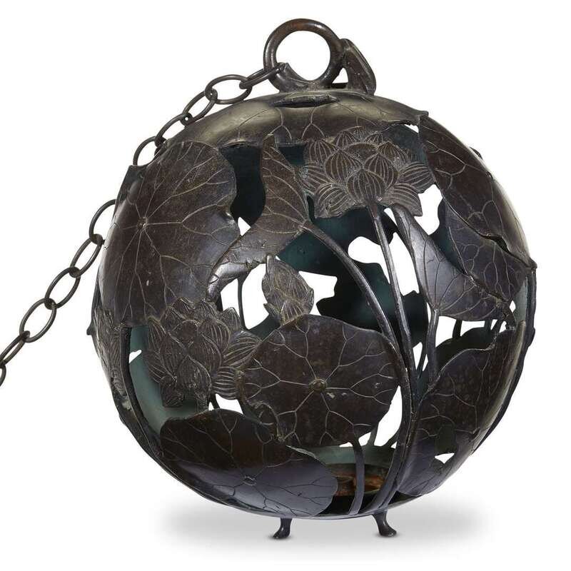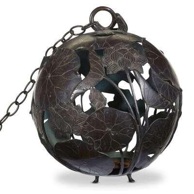 The body cast with various leaves and blossoms, the interior painted blue-green, bottom of the interior with a candle holder, raised on three short feet.