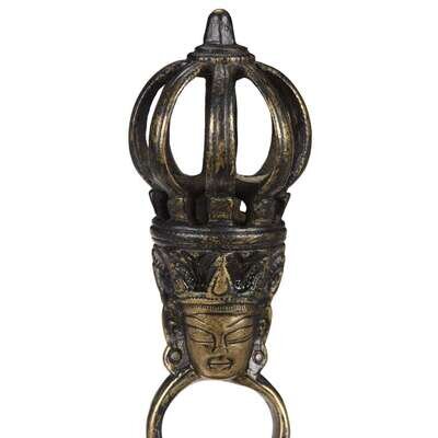 The handle of the bell with ring form, open vajra-ended finial, the double-vajra with eight tines.