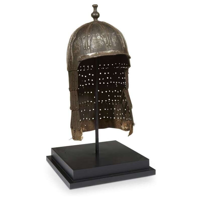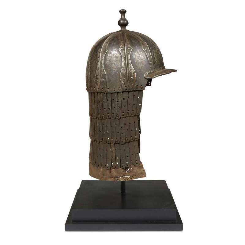 A Tibetan inlaid iron lamellar helmet possibly 16th/17th century with possibly later lamellae