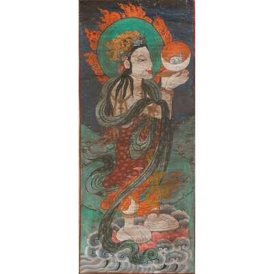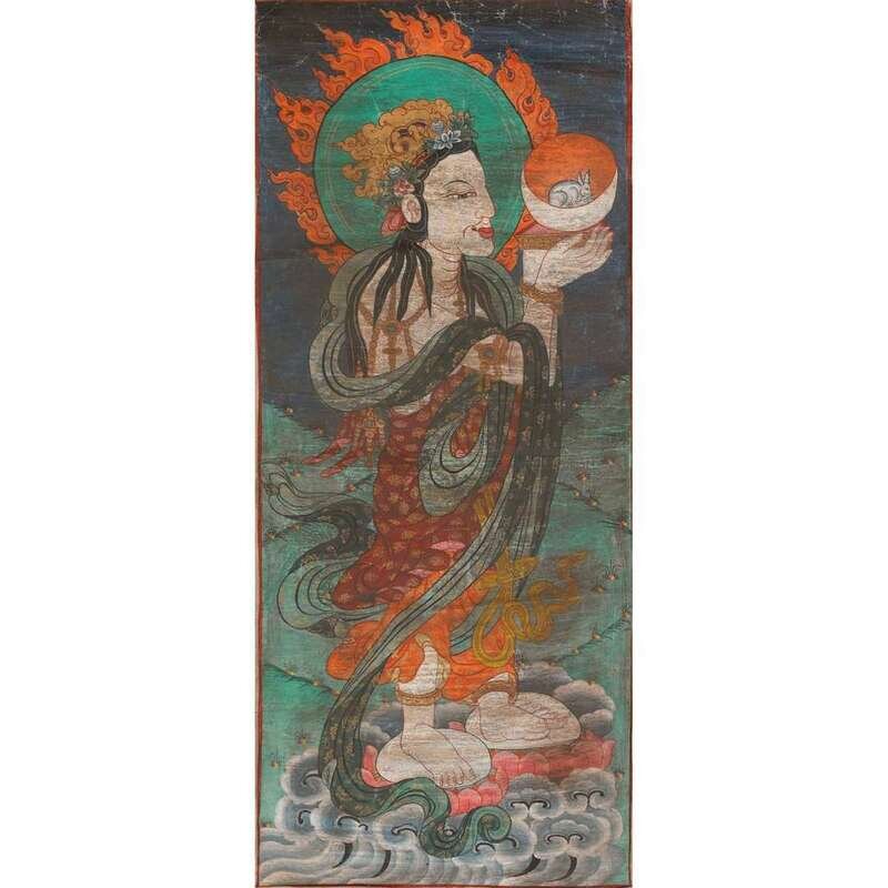 Depicting a female bodhisattva holding the rabbit of the crescent moon.
