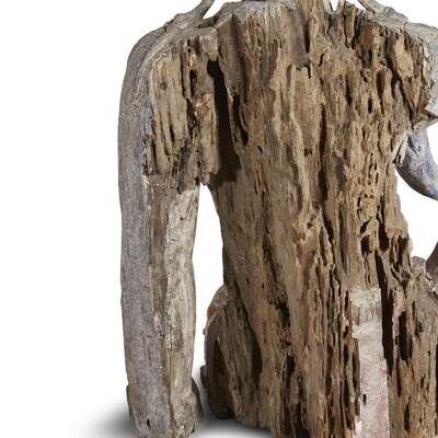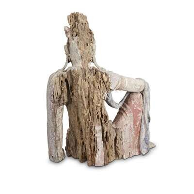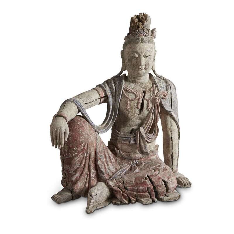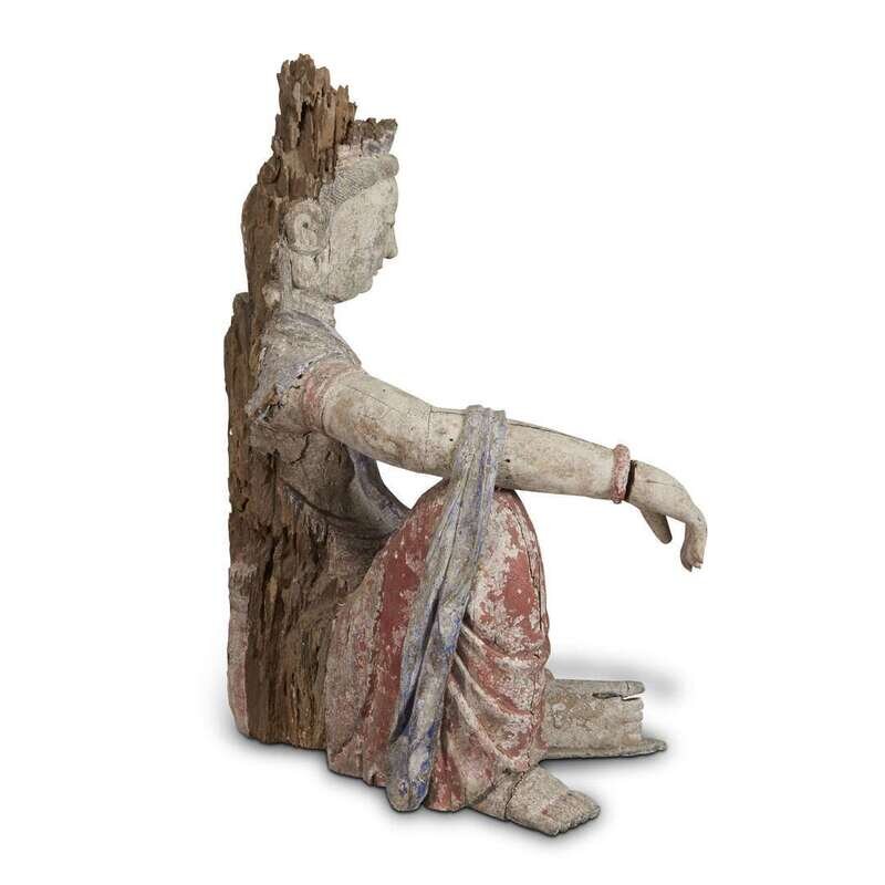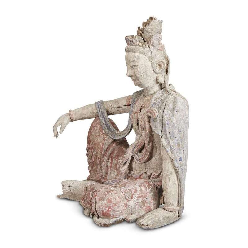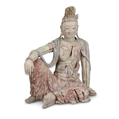 A Chinese carved and painted figure of Guanyin seated possibly ming dynasty or earlier