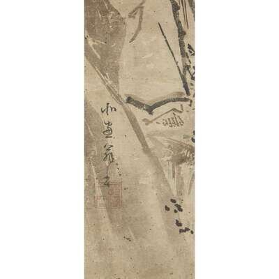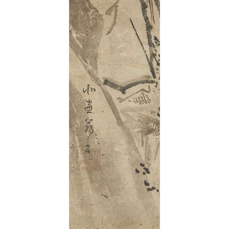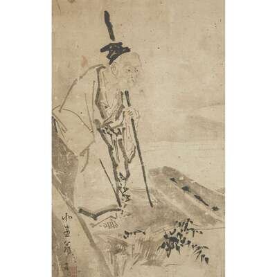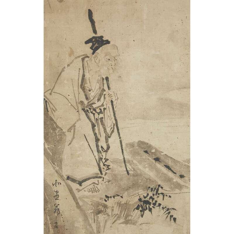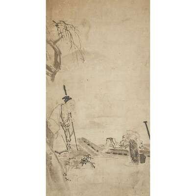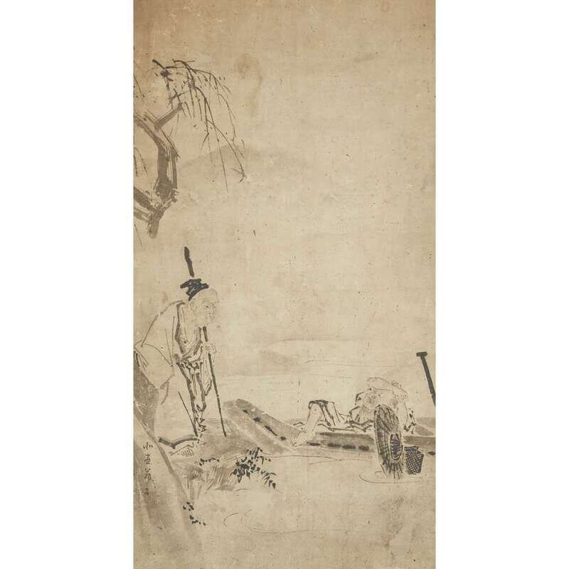 SAGE AND MAN ON A BOAT Ink on paper, inscribed and with one seal to lower left, mounted as a hanging scroll.