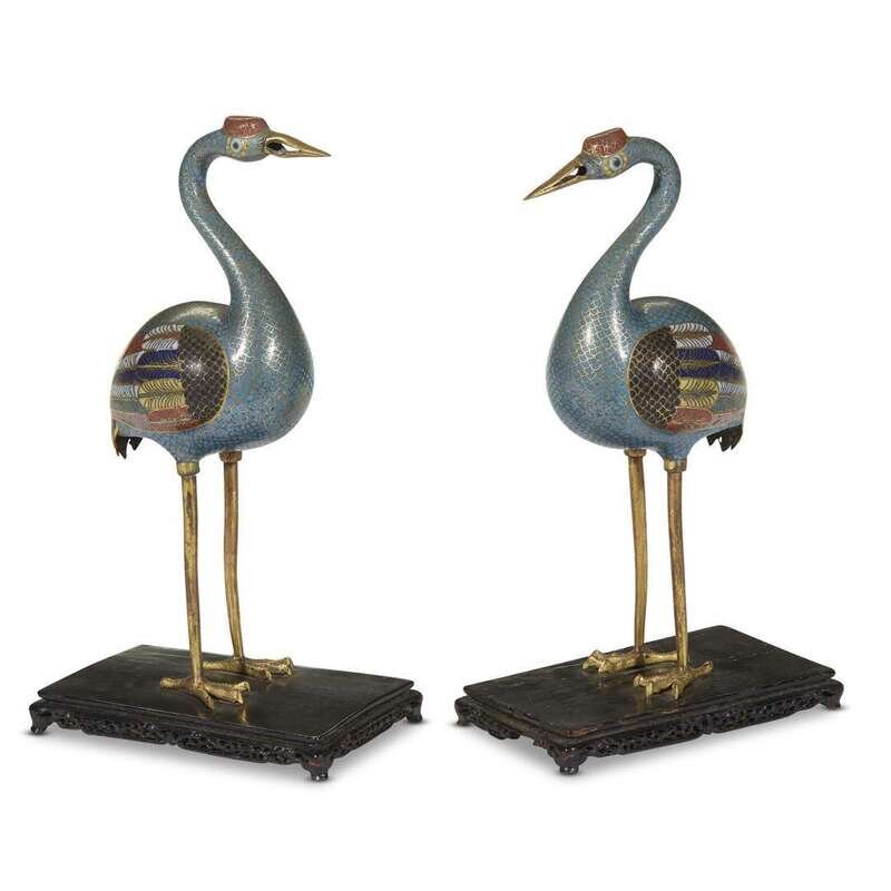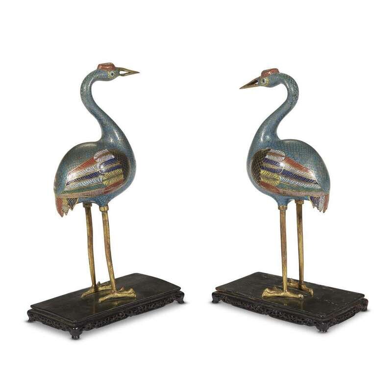 Pair of Chinese cloisonné cranes on later lacquered wood stands qing dynasty, qianlong/jiaqing period