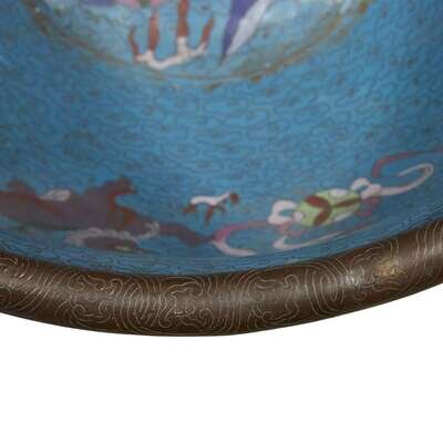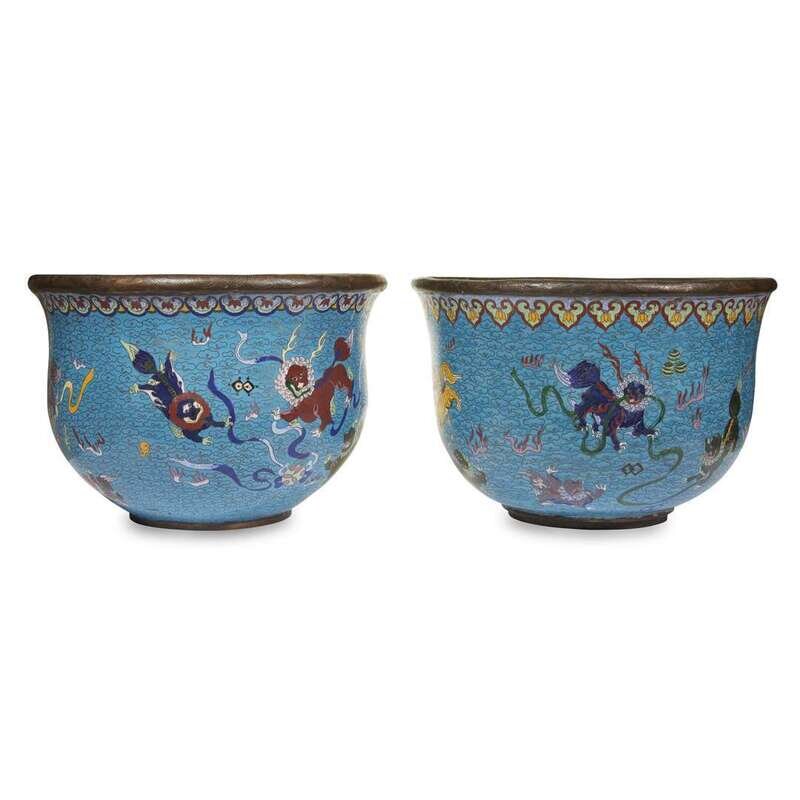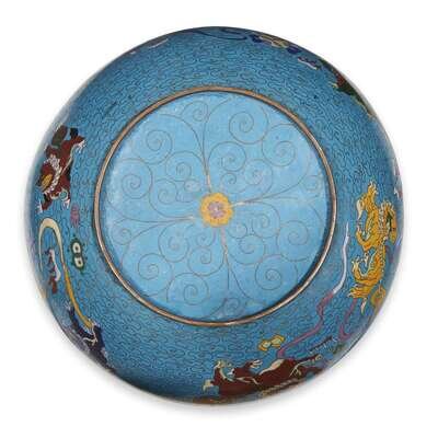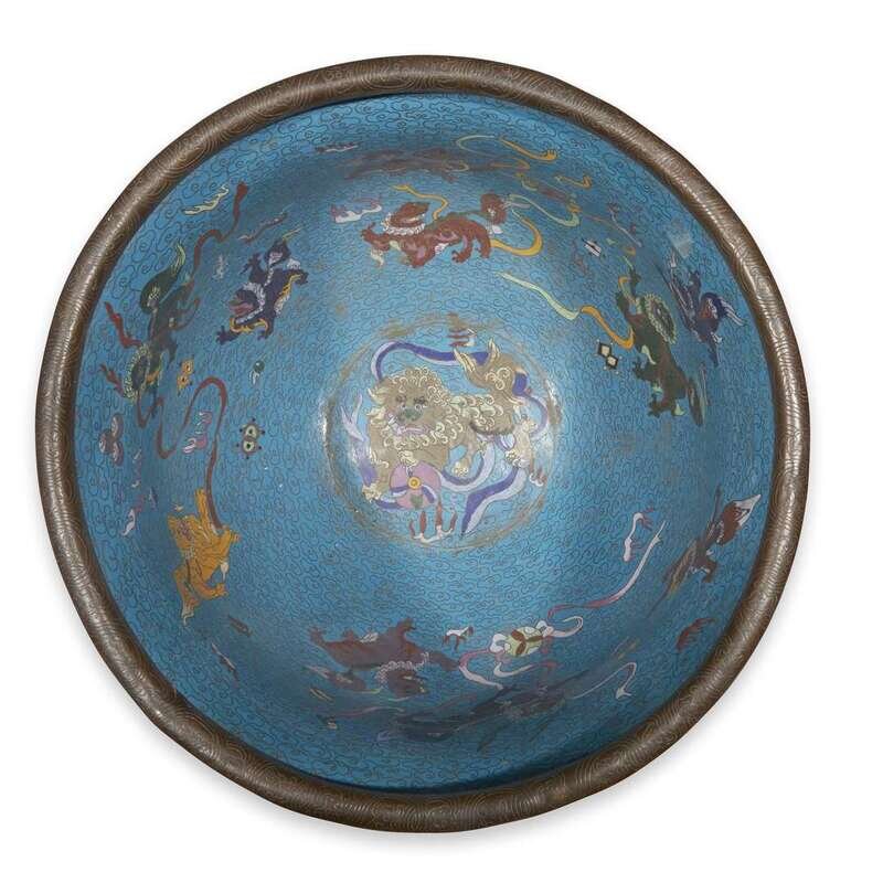The interior and exterior with Buddhist lion decoration, the rims engraved with scrollwork.