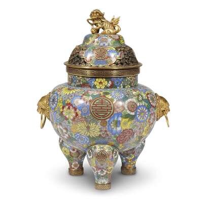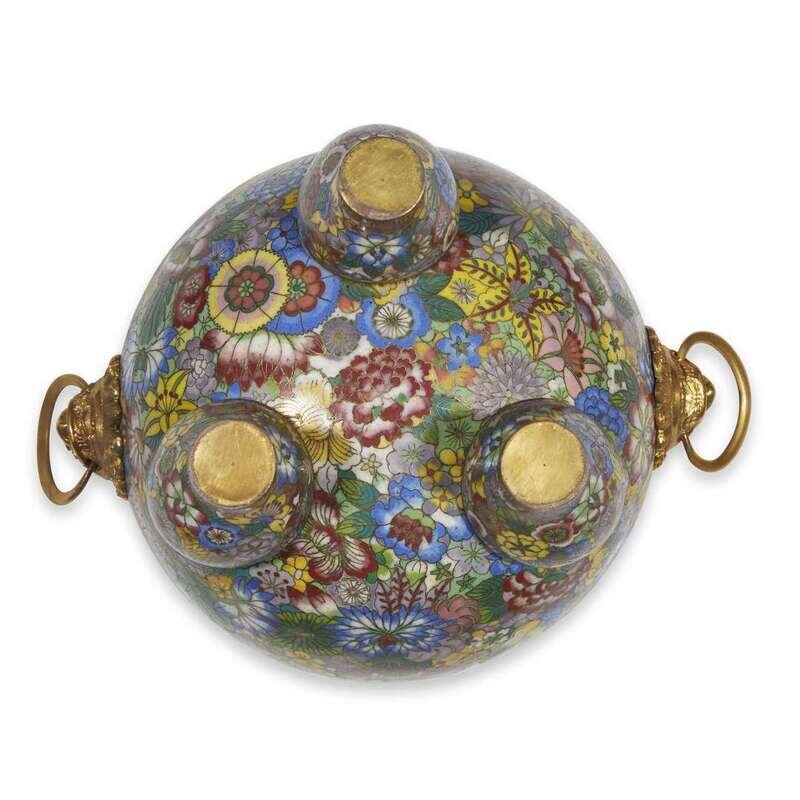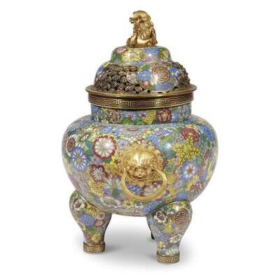 A Chinese cloisonné and parcel gilt "Millefleurs" tripod censer