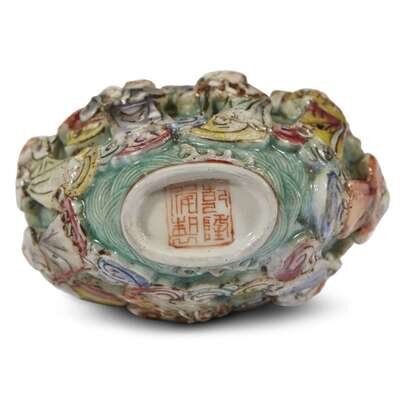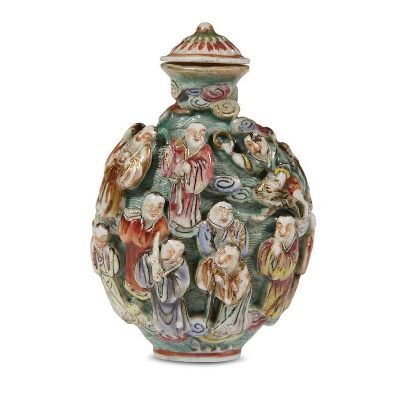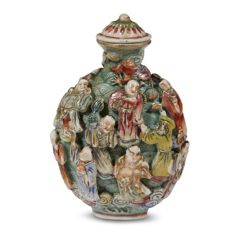 A Chinese molded and enameled porcelain "16 Lohan" snuff bottle inscribed with four-character qianlong mark