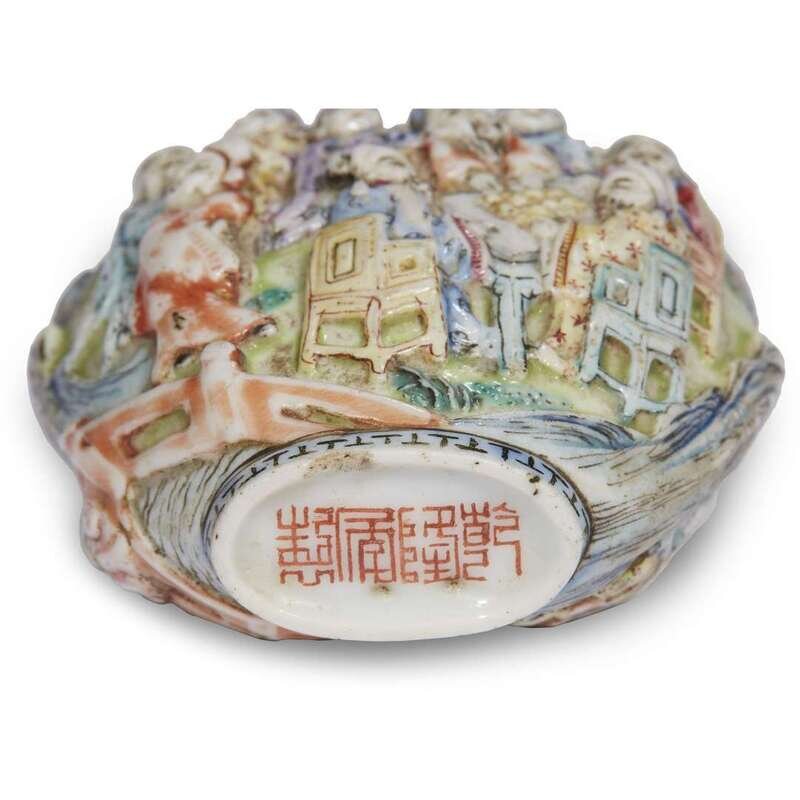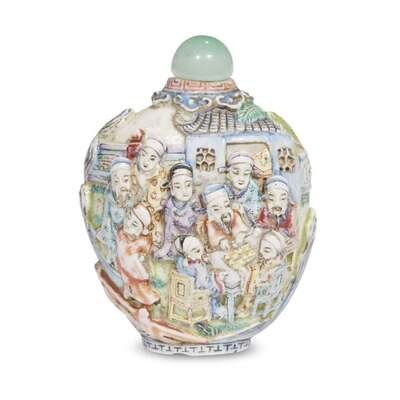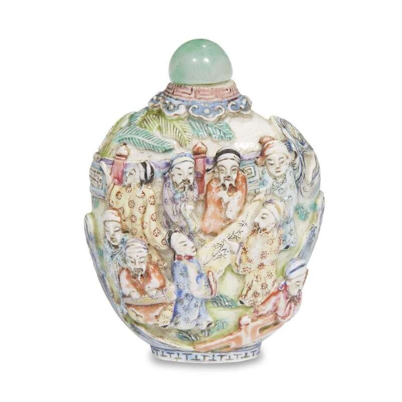 A Chinese molded and enameled porcelain "Sages" snuff bottle four-character qianlong mark