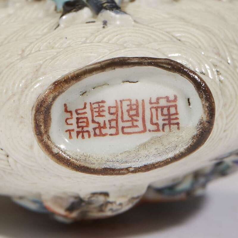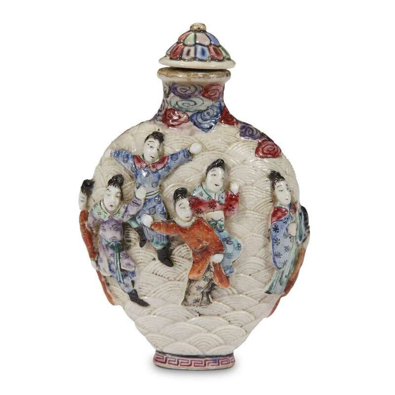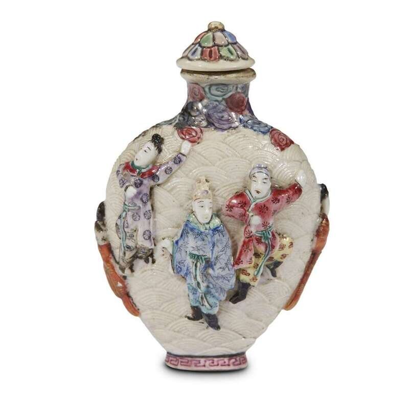 An Chinese enameled and molded porcelain snuff bottle with dramatic figures four character qianlong mark, probably 19th century