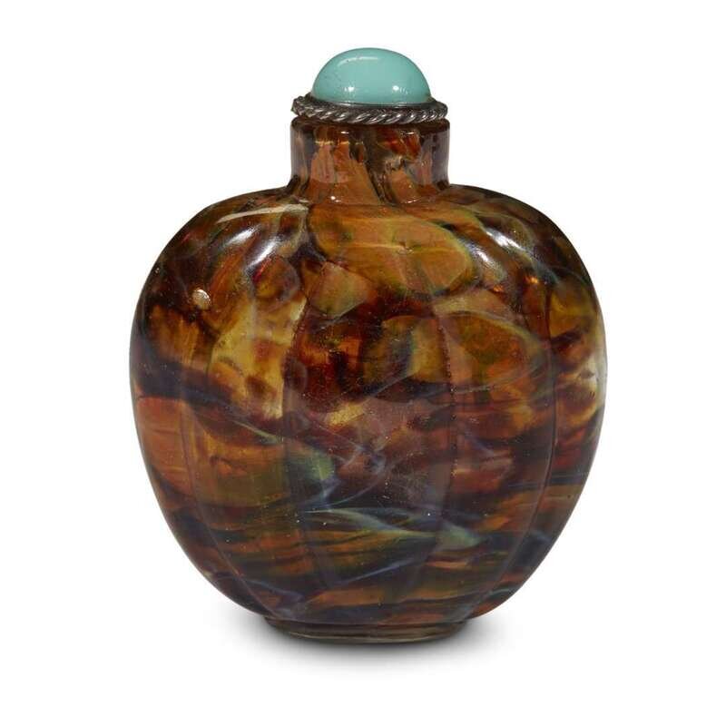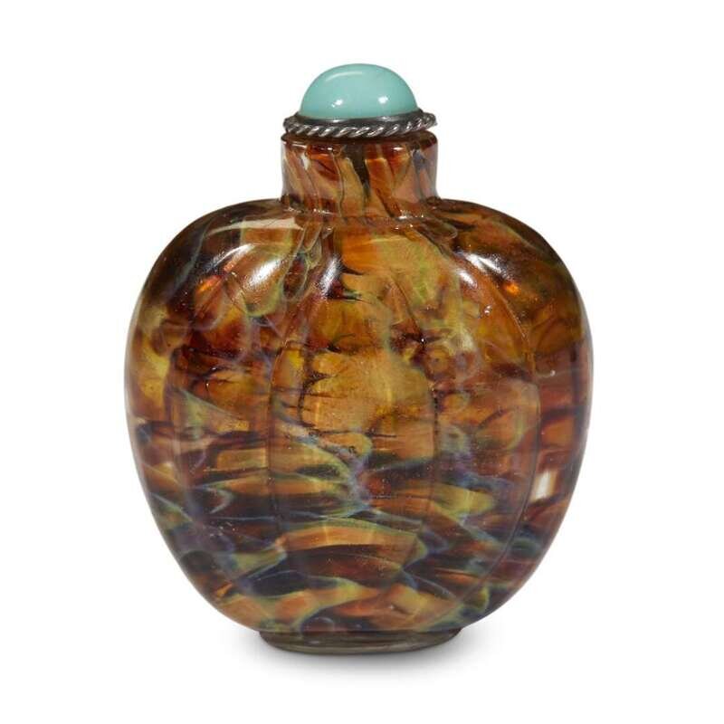 A Chinese spotted and swirled molded glass melon-form snuff bottle