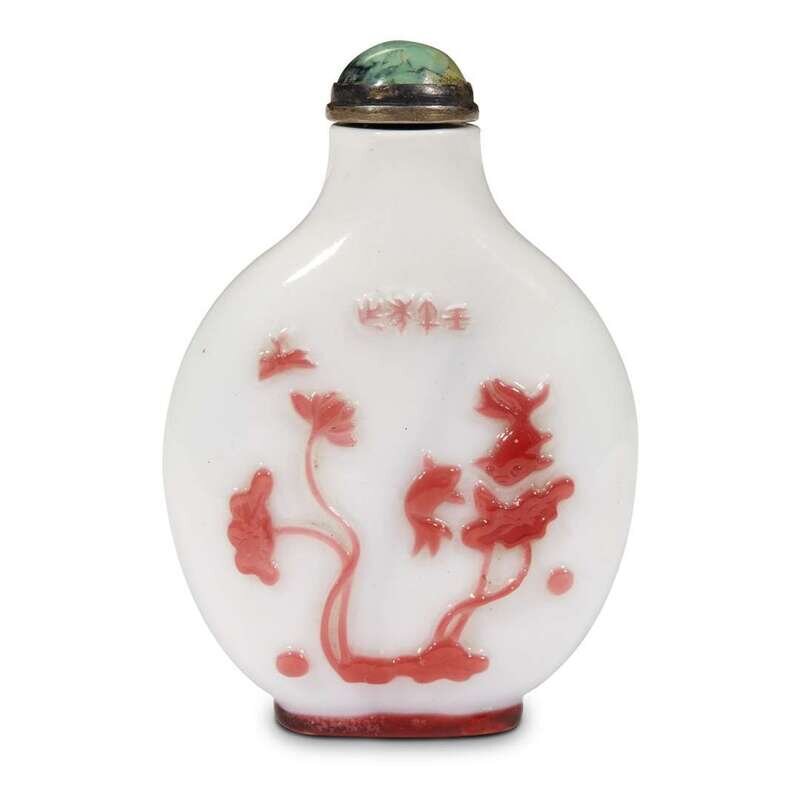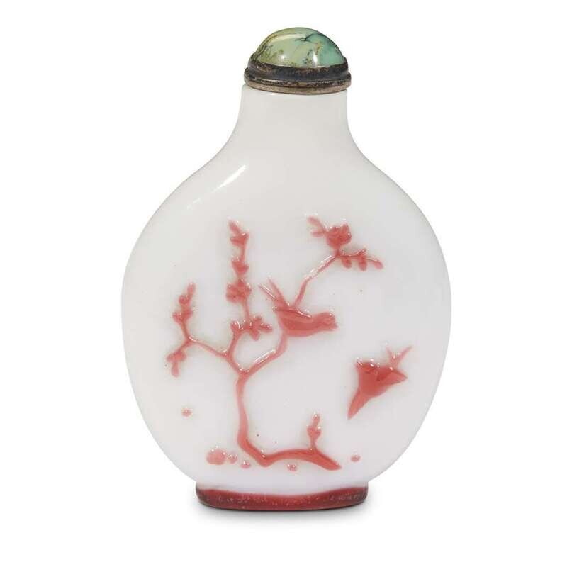 A Chinese Yangzhou school red overlay on opaque white snuff bottle