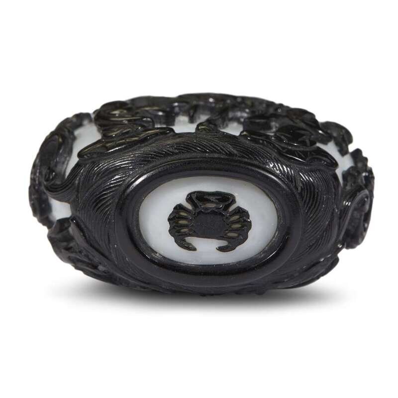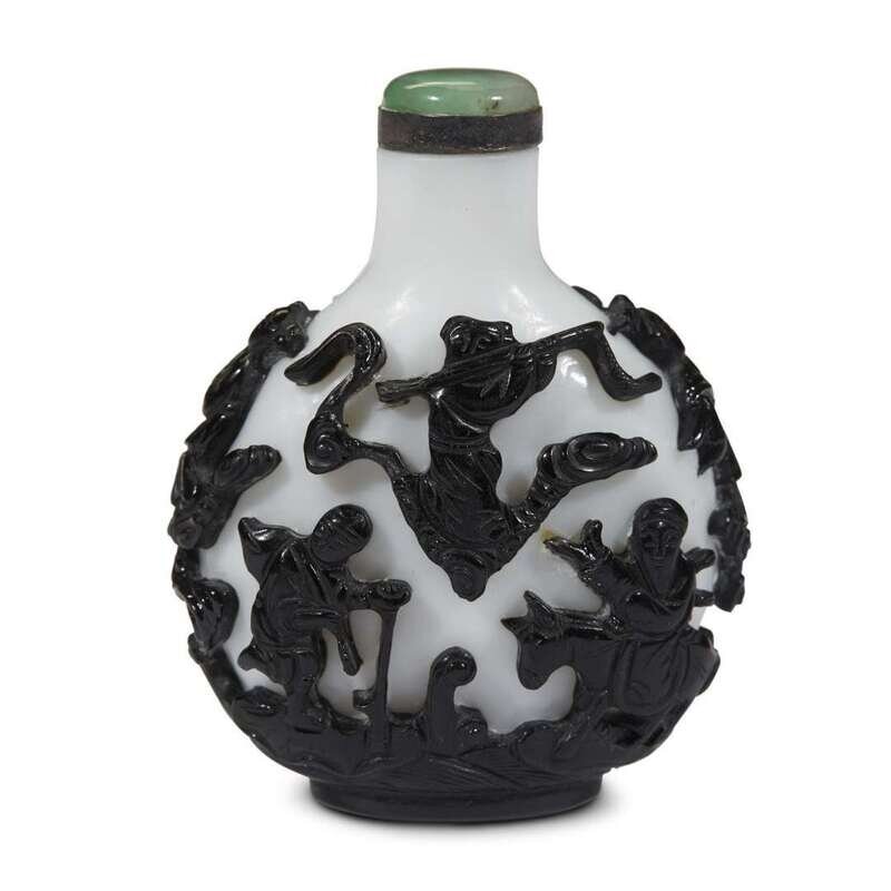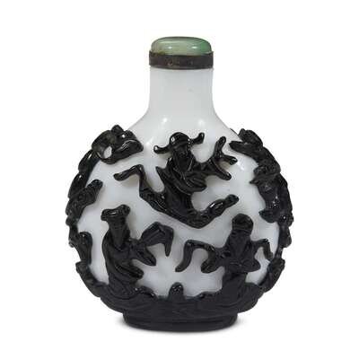 A Chinese black overlay on milky white ground "Eight Daoist Immortals" snuff bottle