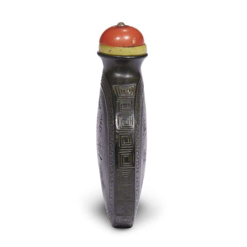 The first of flattened globular shape, with a flat lip, both sides finely carved with a poetic inscription; the second inscribed with Chinese verses and the bottom with "Shendetang Zhi " four-character mark.