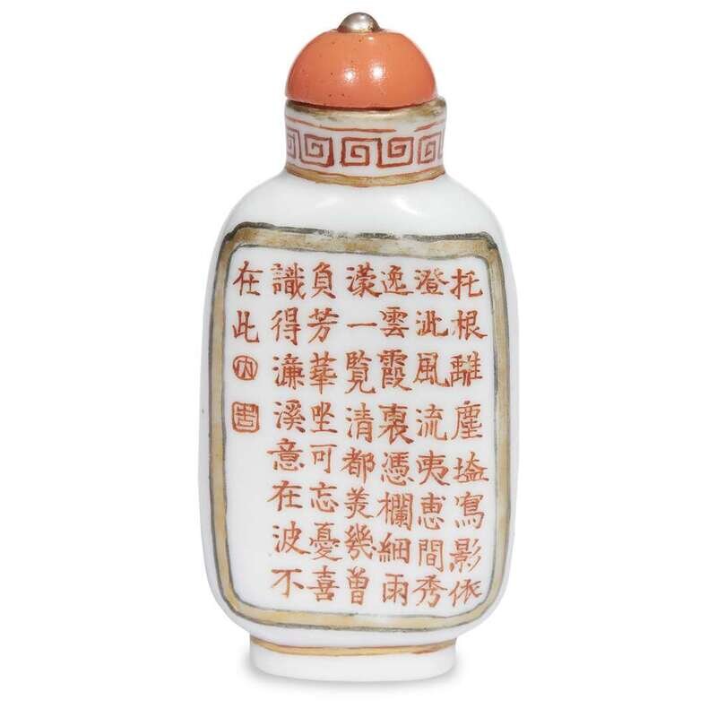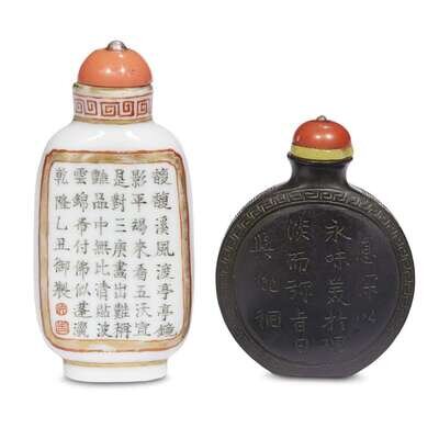 A Chinese "Duan" stone snuff bottle and a Chinese enameled porcelain snuff bottle 19th/20th century