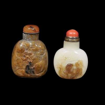 comprised of a mottled brown agate bottle skillfully carved, incorporating the various colors of the stone to depict a seated sage under pine trees, and an ovoid bottle carved to show a spirited brown horse against the white ground.