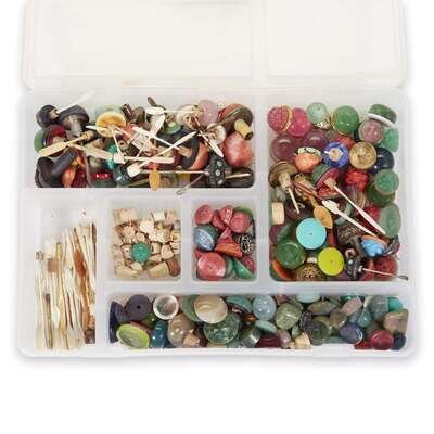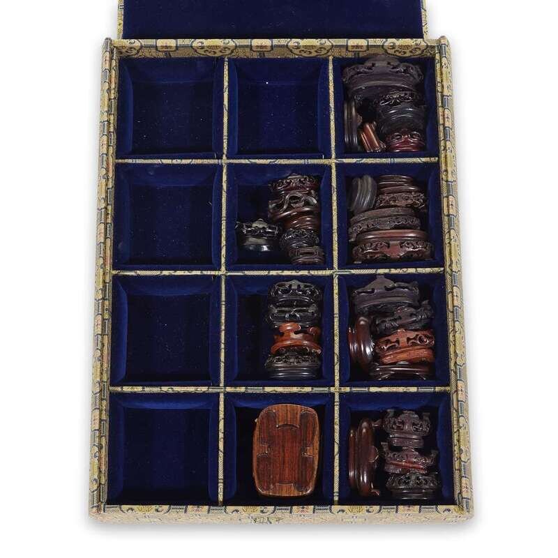 A large assorted group of Chinese carved wood snuff bottle stands, glass and hardstone stoppers and spoon elements