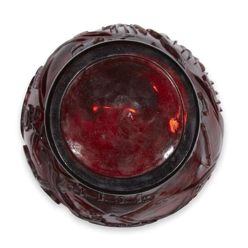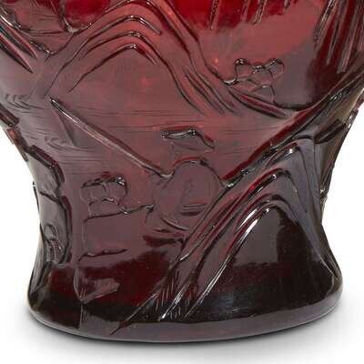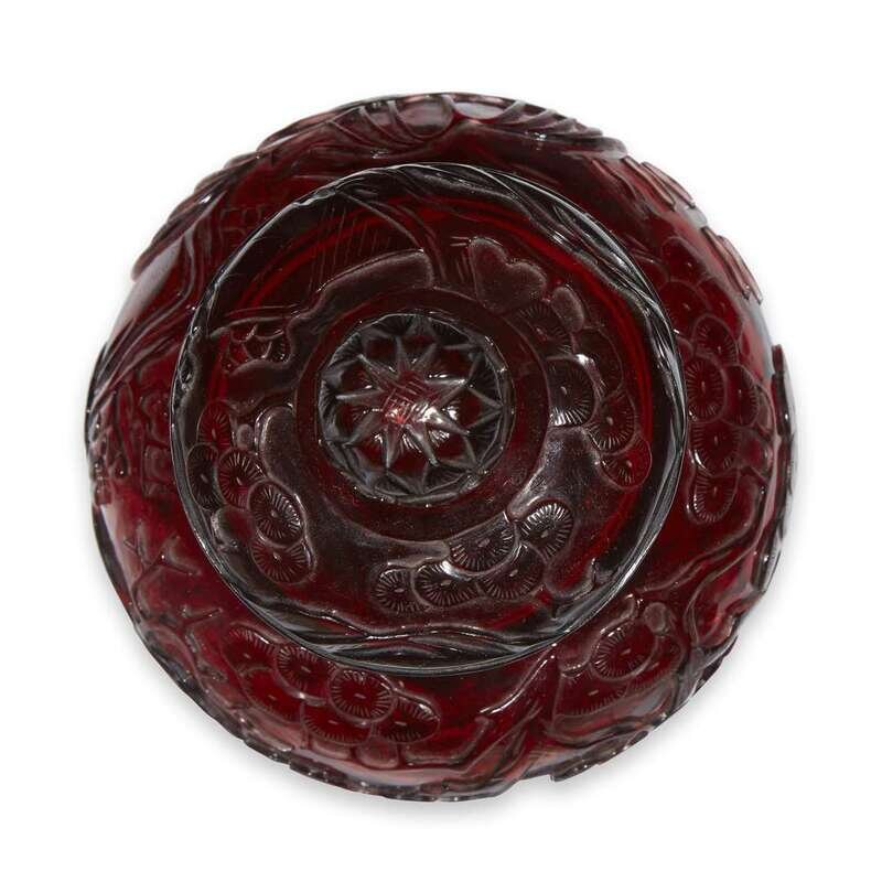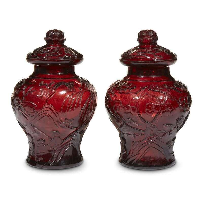 A pair of Chinese carved ruby glass "Landscape" covered baluster vases