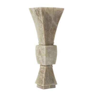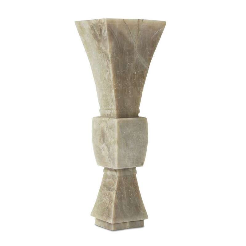 Of square section, carved with lappets and taotie masks, the stone a pale celadon with beige and grey inclusions.
