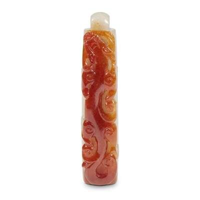 A Chinese carved grey-white and russet jadeite "Qilong" plume holder qing dynasty