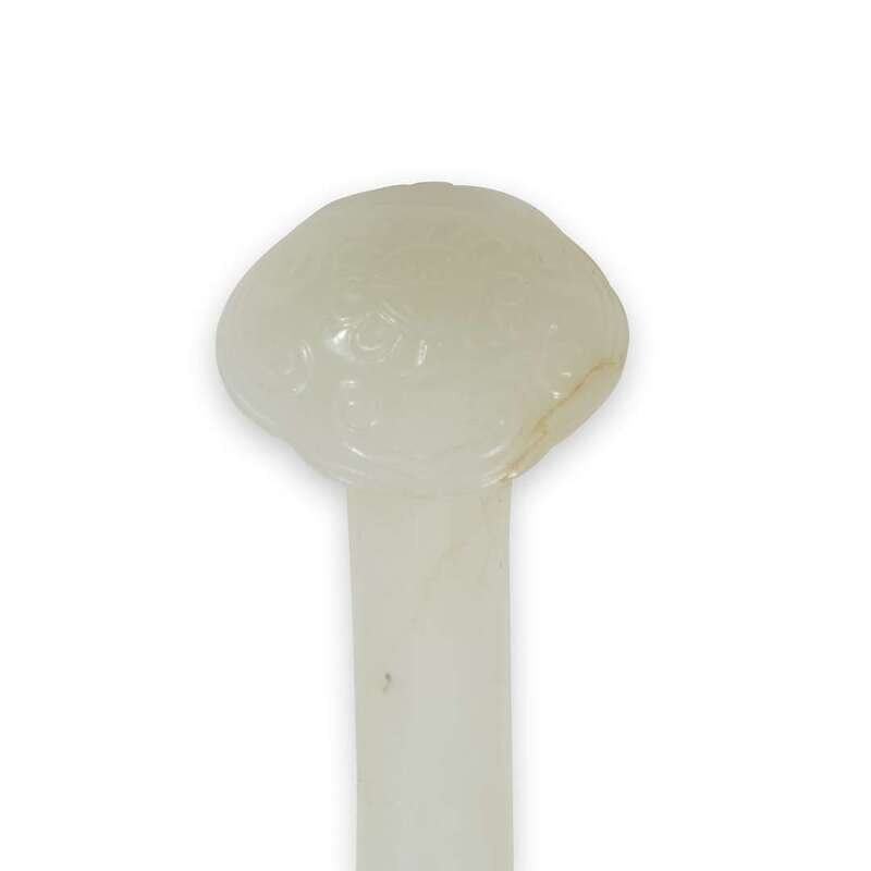 The head carved in the shape of a ruyi, the stone of mottled greyish white with a trace of russet at the head.