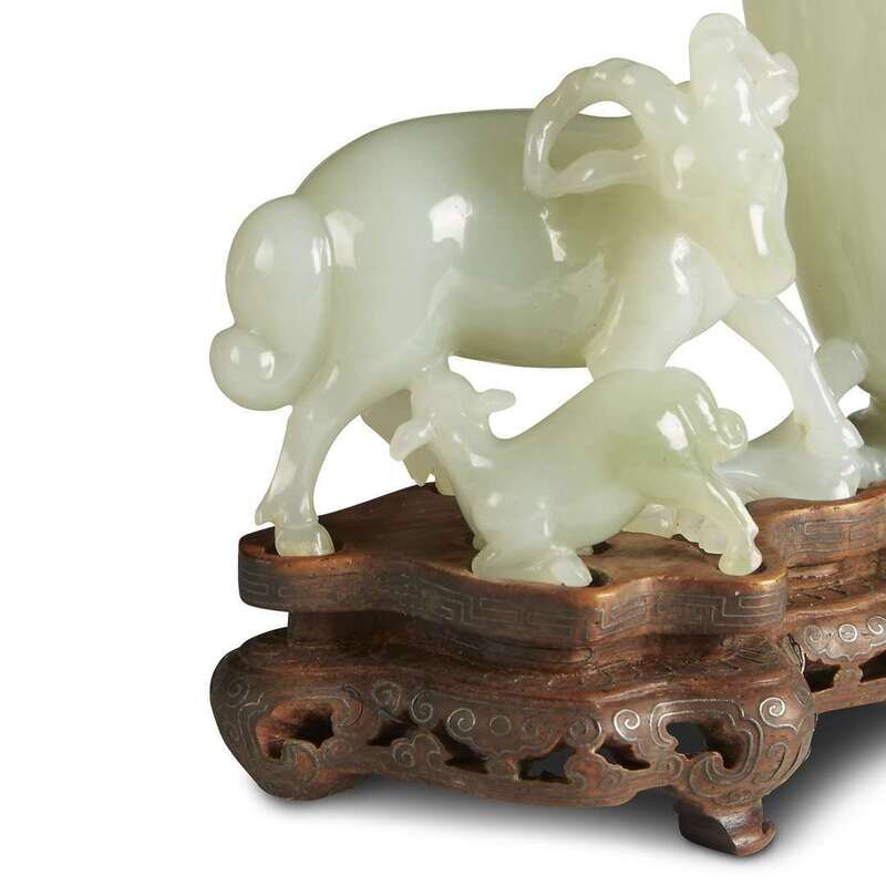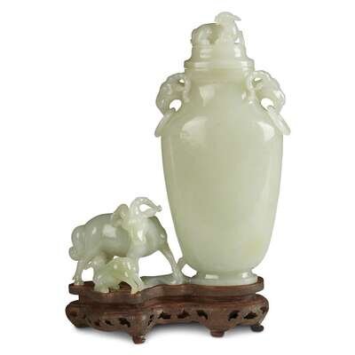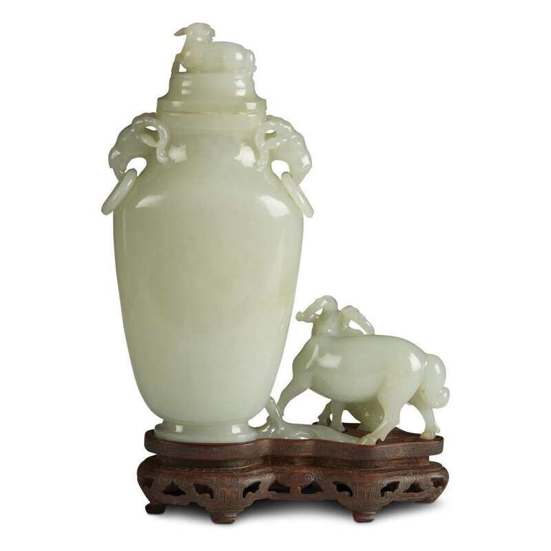 A finely carved Chinese celadon jade "Three Rams" vase and cover