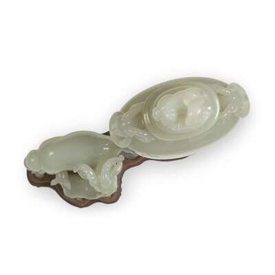 Well-hollowed, with a ewe suckling its young, another kid recumbant on the domed cover, two rams-heads with loose rings at the shoulder, of a very even celadon tone with only slight variations at the extremities and a few scattered lighter suffusions, on a silver wire-inlaid carved wood stand.