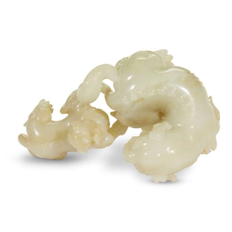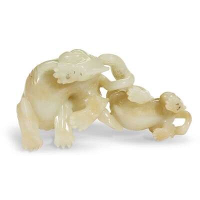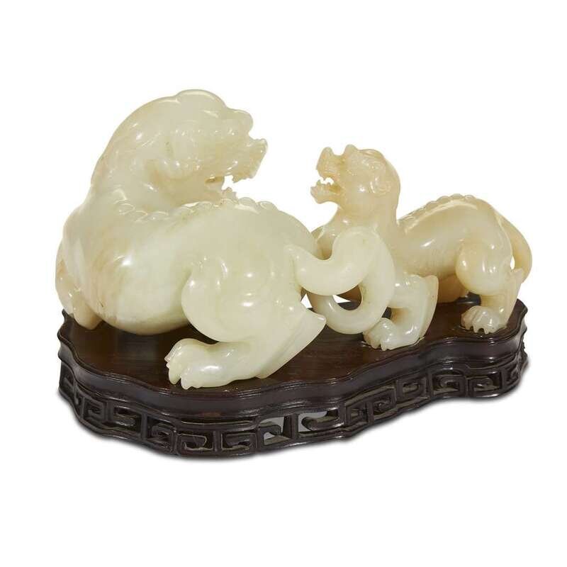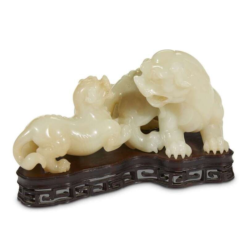 A Chinese creamy-white and pale celadon jade "Tashi Xiaoshi" group with wood stand