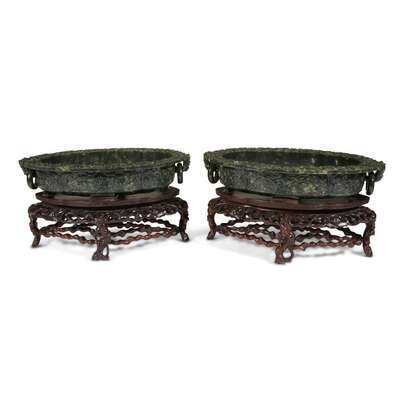 Each of lobed oval form with wide lip, stylized insect handles with loose rings, top and sides with lotus scrolls, underside with four-character seal mark, the stone of dark green with paler mottling, the hardwood stands carved with flowers and branches.