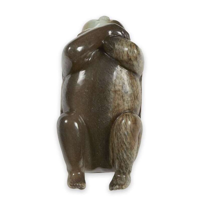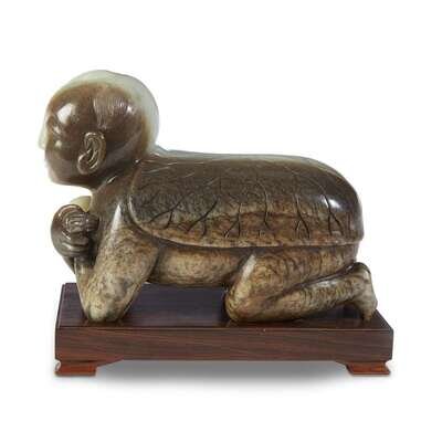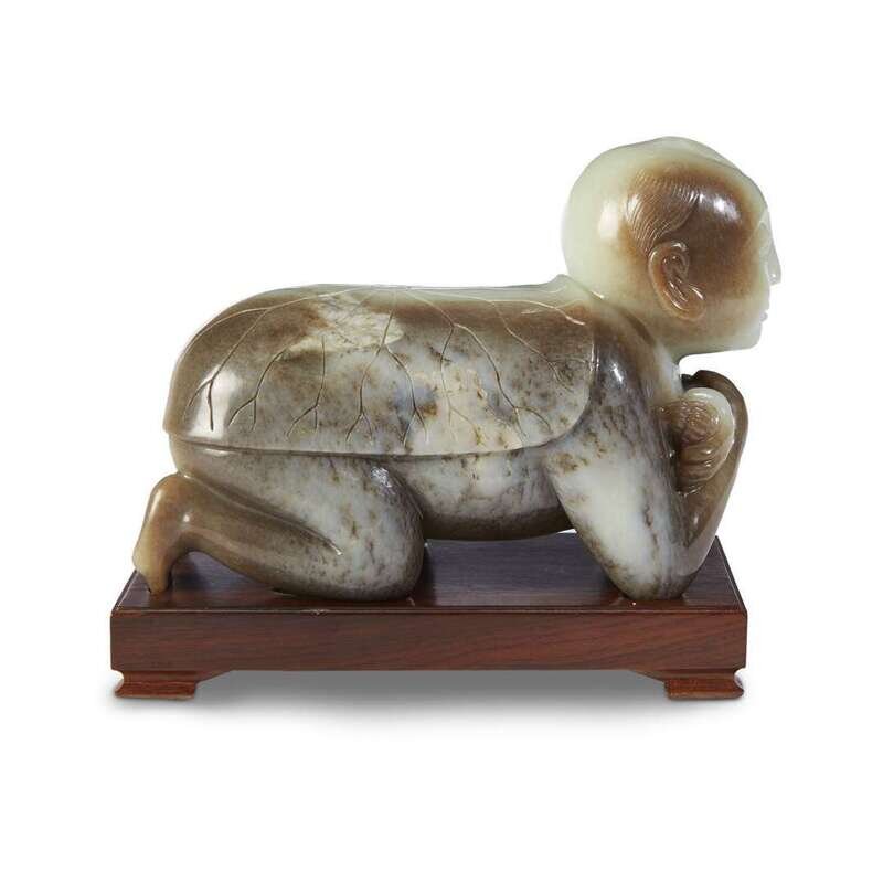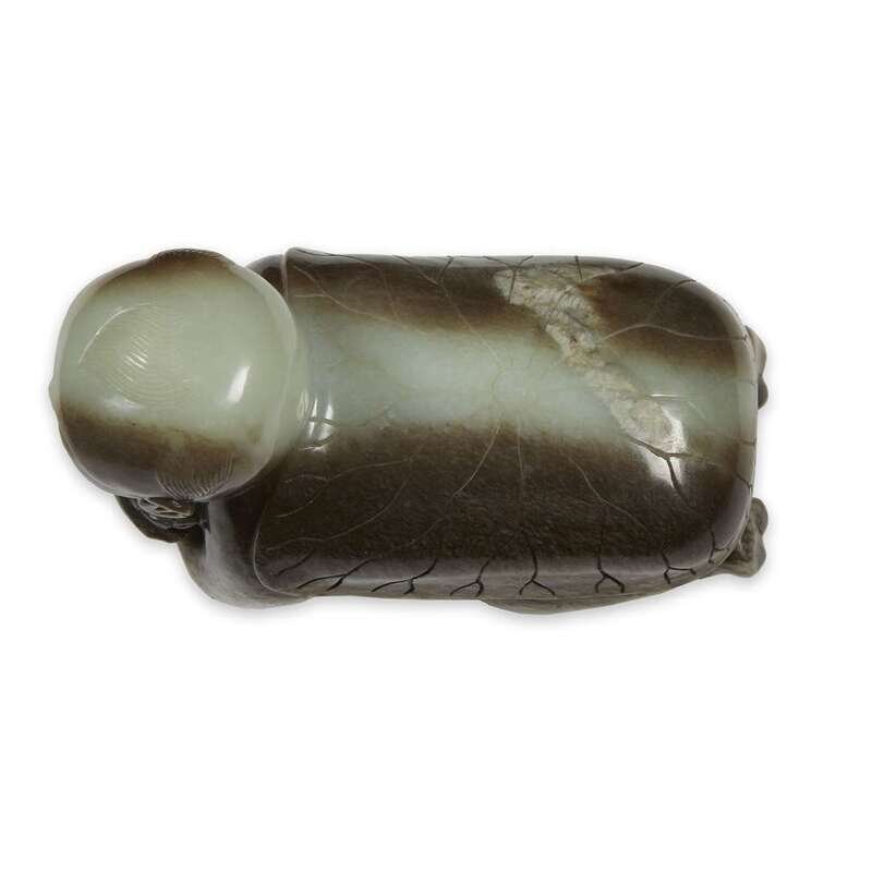 Chinese carved celadon grey and brown jade "Boy" pillow