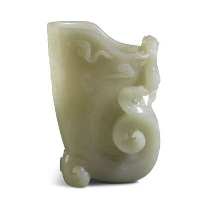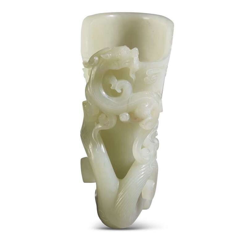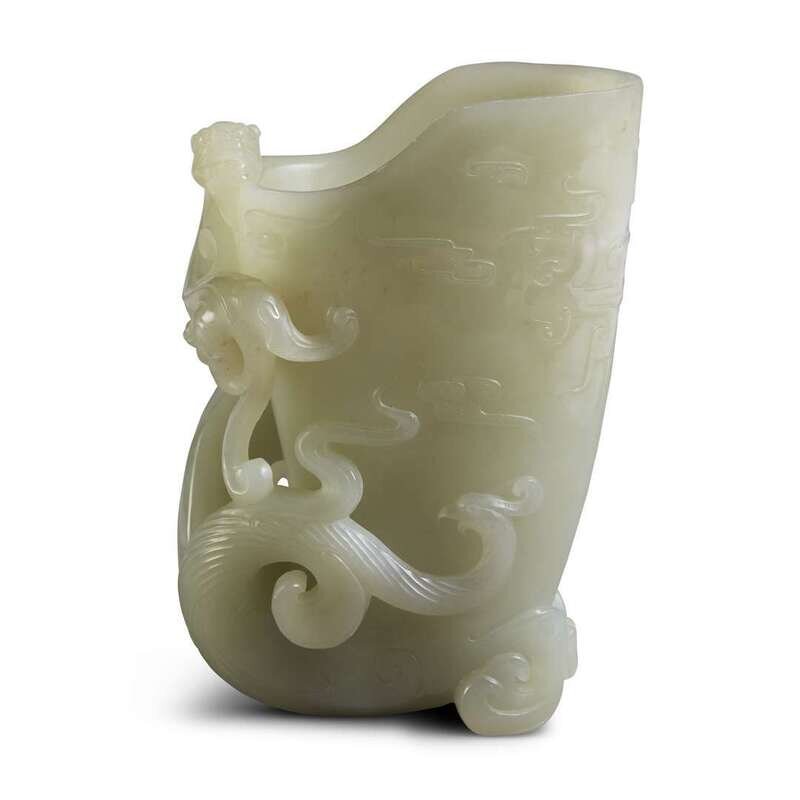 Carved with qilong to the top and a stylized phoenix to the base, the body with cloud and archaistic phoenix relief, the stone of a very even tone with a few darker linear inclusions to the base, and scattered specks.