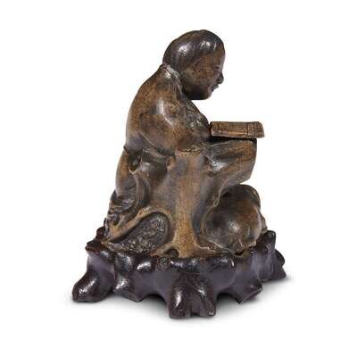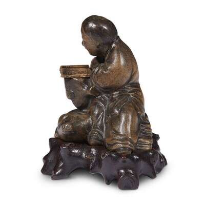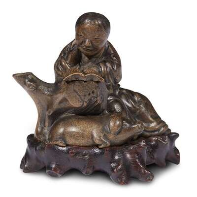 Depicting the poet seated beside a tree trunk, a pig lying under his feet, carved wood stand. NOTE: The present depiction probably refers to the poem by Hanshan comparing the interrelationship of man to pig.