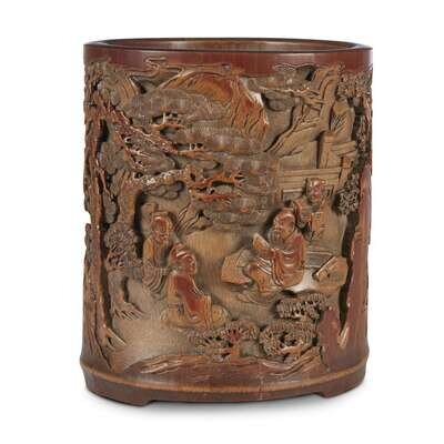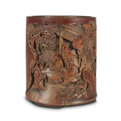 Depicting seven scholars and an attendant in an extensive landscape, the various colored layers of the bamboo, cleverly carved, incised "Wu Zhifan" and with one incised seal "Lu Zhen".
