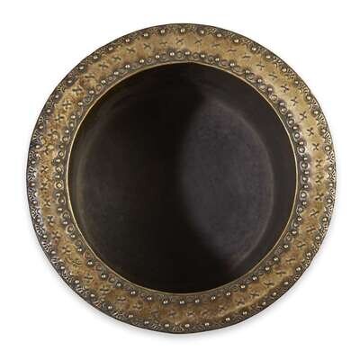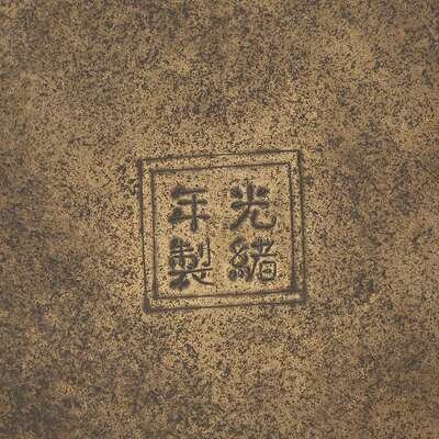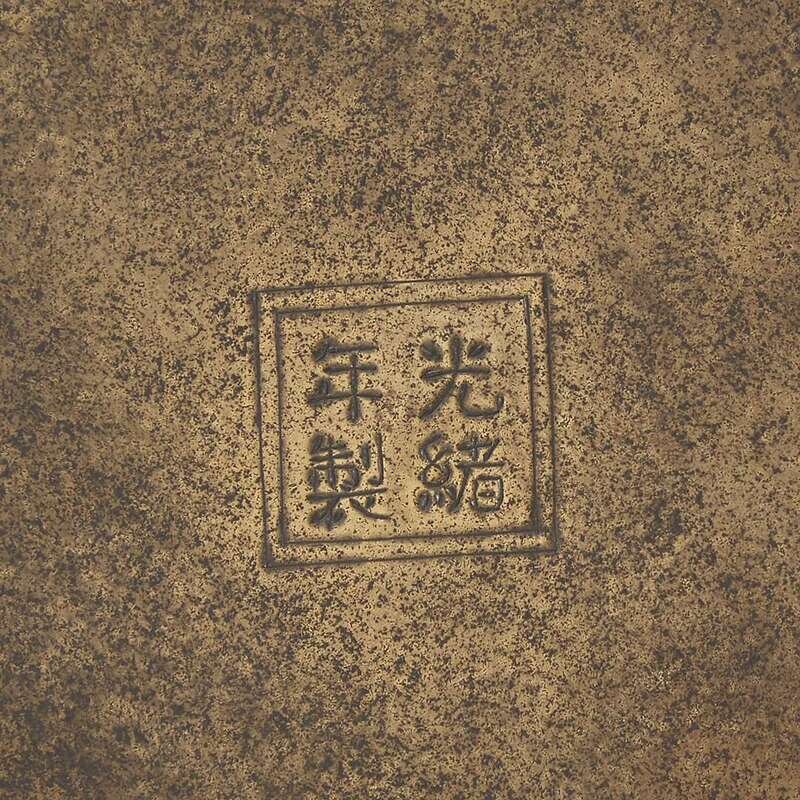 Of a dark, dense wood with fine wavy grain and rippled surface effect, interior, lip and base covered by brass with rivet and X pattern, underside incised with a four-character Guangxu mark.
