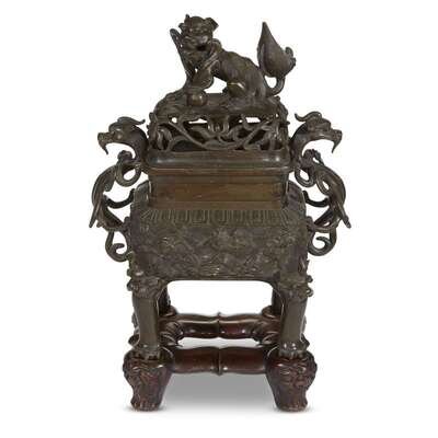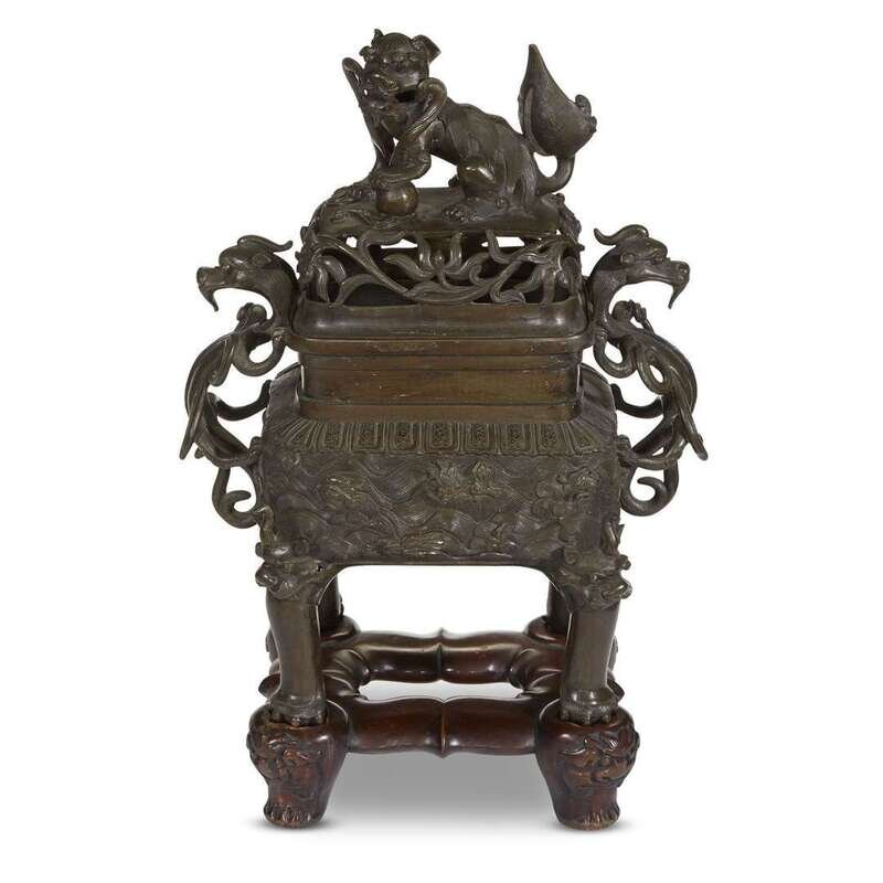 A Chinese bronze fang ding censer and cover with Buddhist lion finial xuande mark, qing dynasty